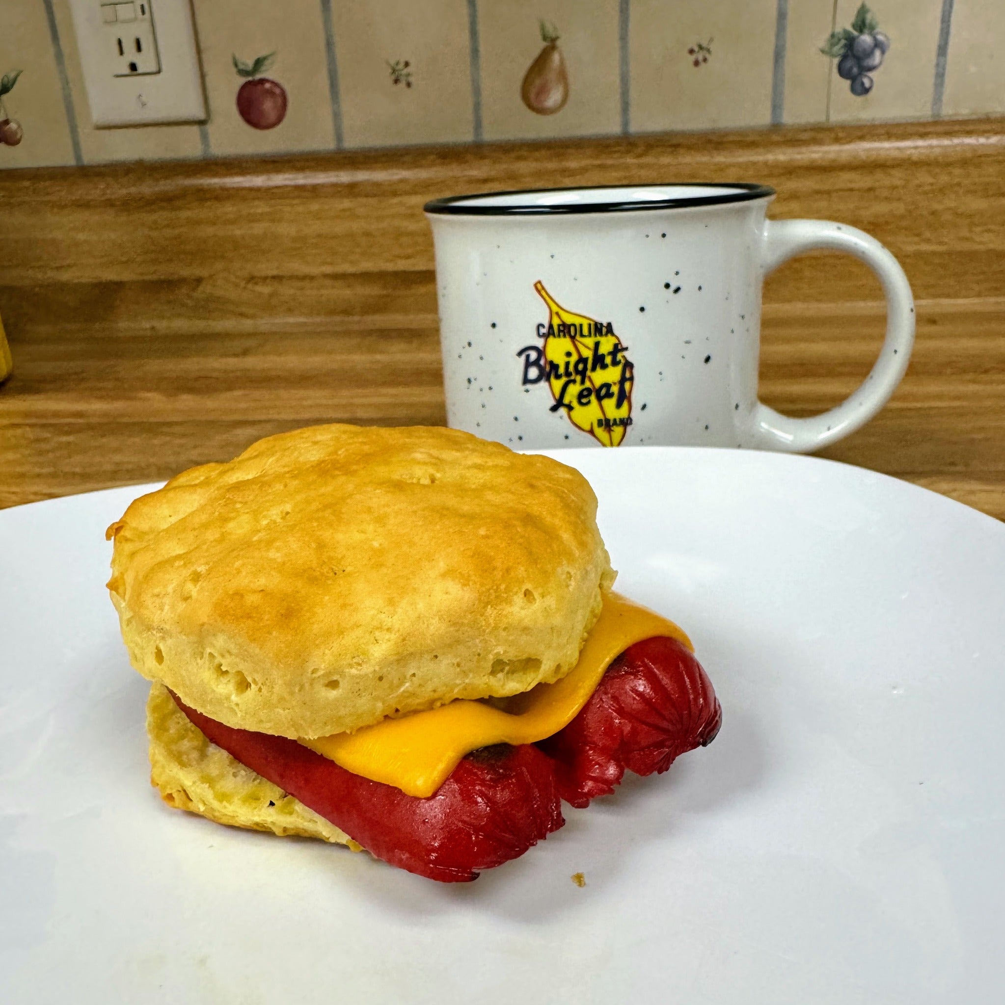 It's the perfect companion for our Down East Brew Coffee and a hearty Bright Leaf breakfast — reds, sausage, bacon, and even hot dogs. Fill it up, grab your plate, and enjoy a true North Carolina morning.