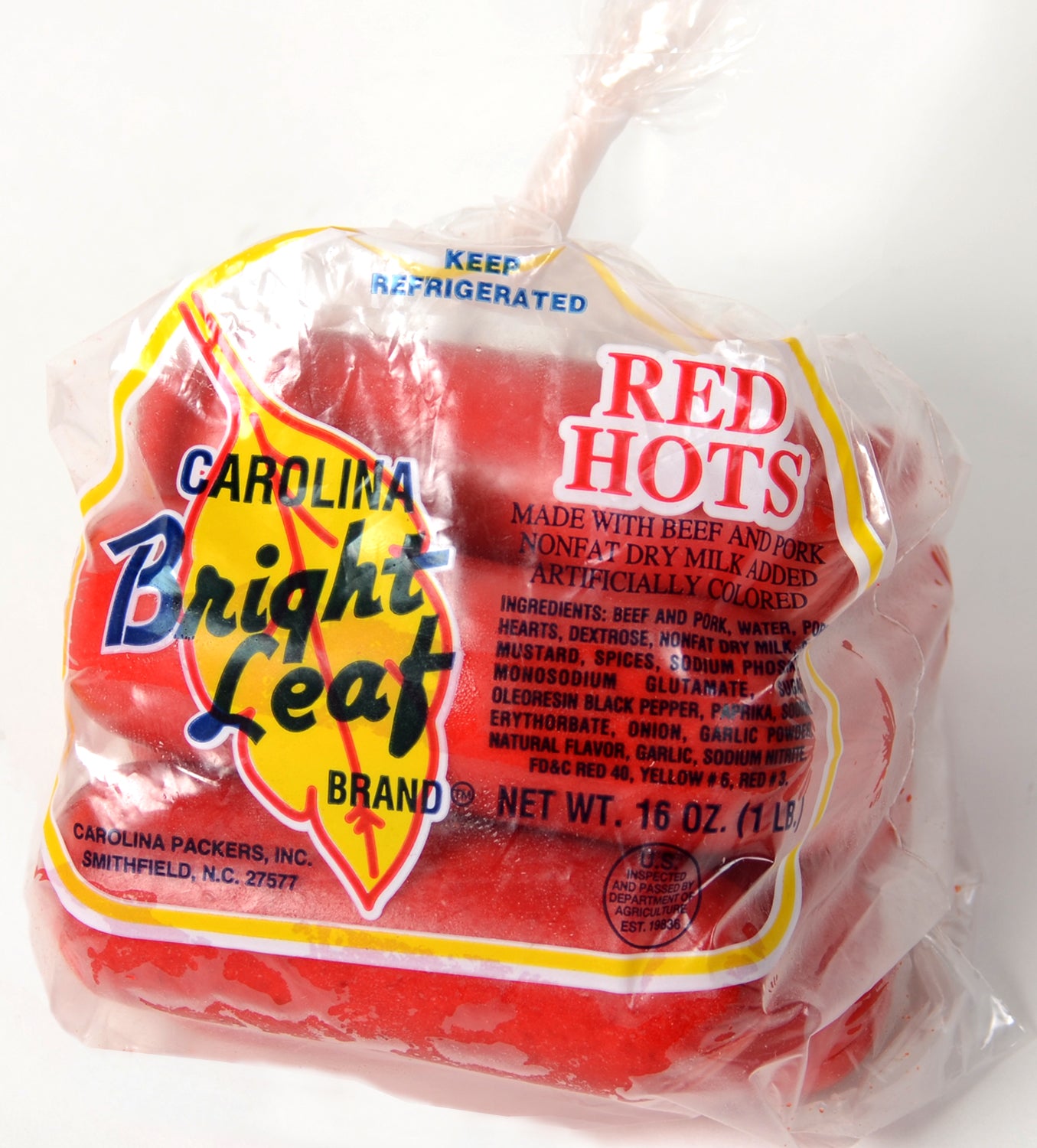 Bright Leaf Red Hots (1 lb) - similar to our Bright Leaf Hot Dogs but with a little crushed red pepper giving them a nice kick. They are a great snack and party treat, and a perfect fit for a biscuit, which has made them an eye-opening breakfast favorite for many folks. (Smithfield, NC)